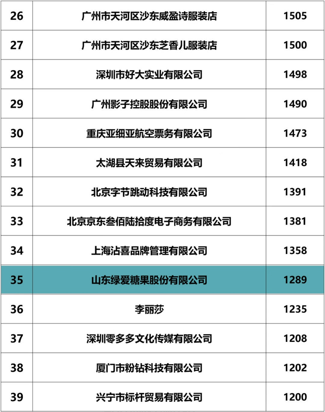 截止2018年6月30日,山東綠愛(ài)糖果股份有限公司,商標申請1289個(gè),,全國排名第35位,山東省排名第1位!